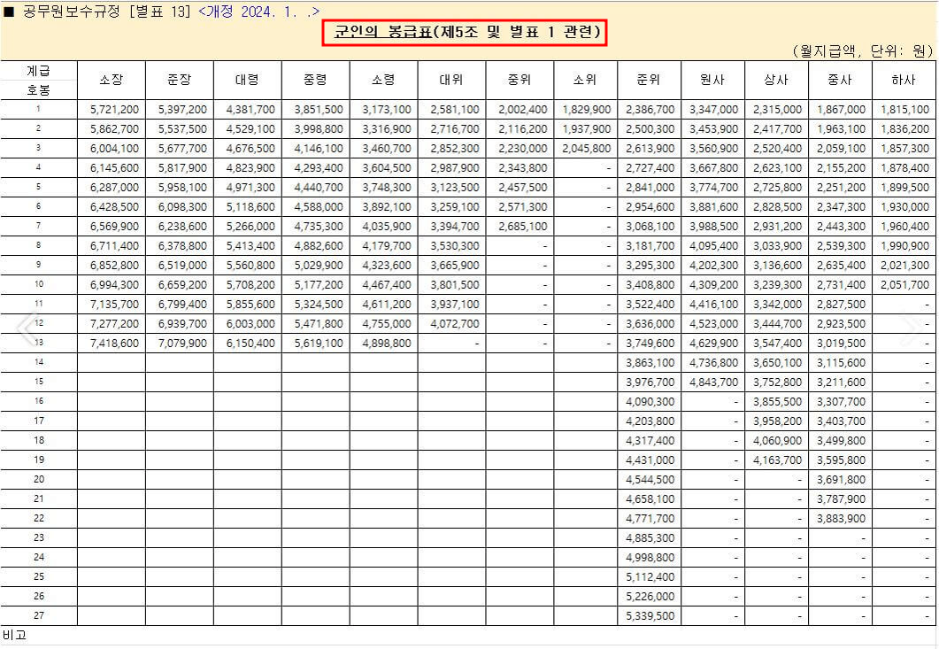 2024년 군인 장교 봉급표 다운로드는 아래를 이용하시기 바랍니다.